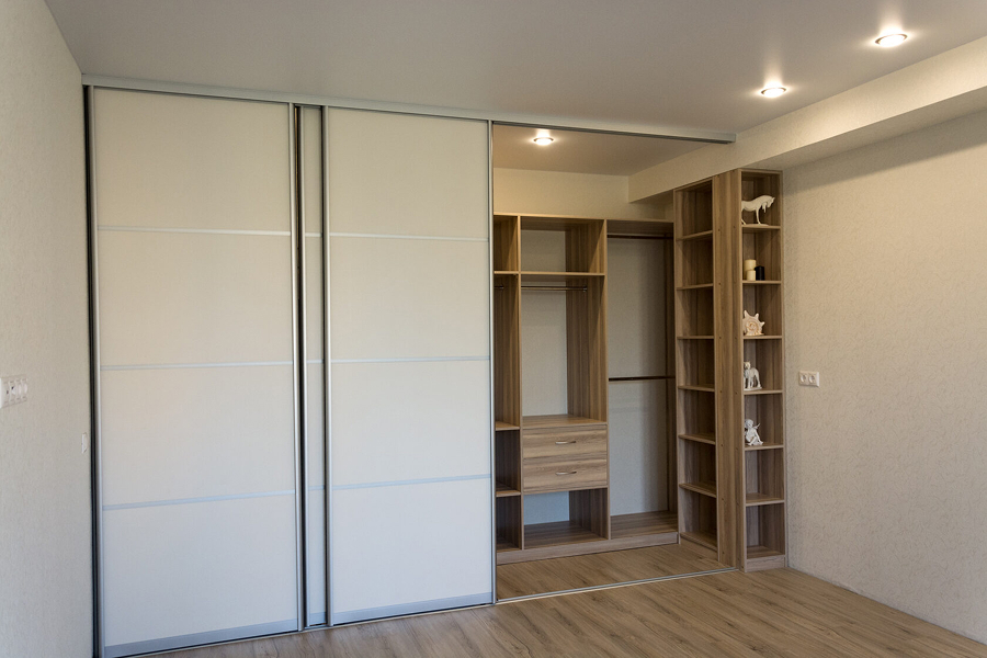 Второй ключ к экономии — выбор стандартных решений. Нестандартная высота, глубина или ширина, радиусные или г-образные фасады значительно удорожают проект. Классический прямоугольный шкаф в полный рост стены будет стоить дешевле.
